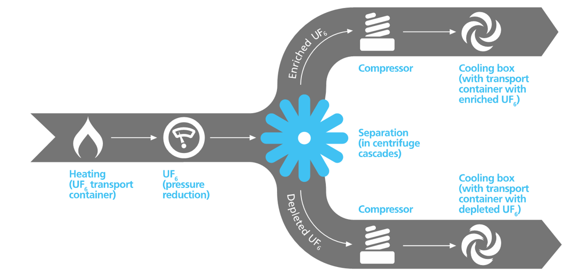 UF6 is solid at ambient temperature. At our enrichment facilities, we connect the transport container holding UF6 to the plant feed system. We then heat the container to vaporise the UF6 and turn it into gas at sub atmospheric pressure.